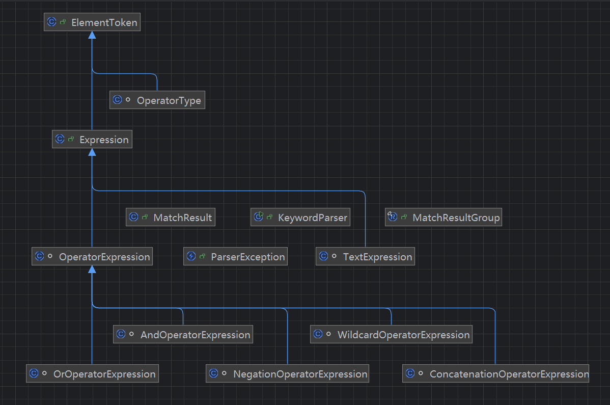 Expression:表示一个表达式,表达式支持匹配操作和转换为文本的能力。表达式分为两类,一类是带运算符的,另一类是文本表达式。